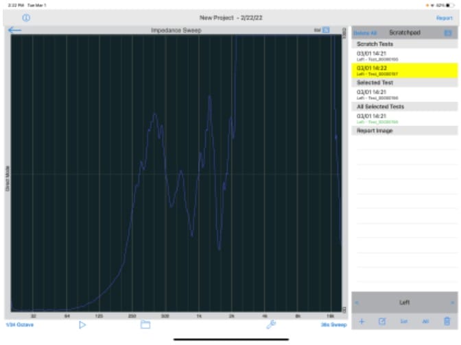 - For a more thorough explanation of how to use the AudioTools impedance sweep, touch the wrench icon located below the plot to get to the Setup page. Next touch the circled i icon on the top left.