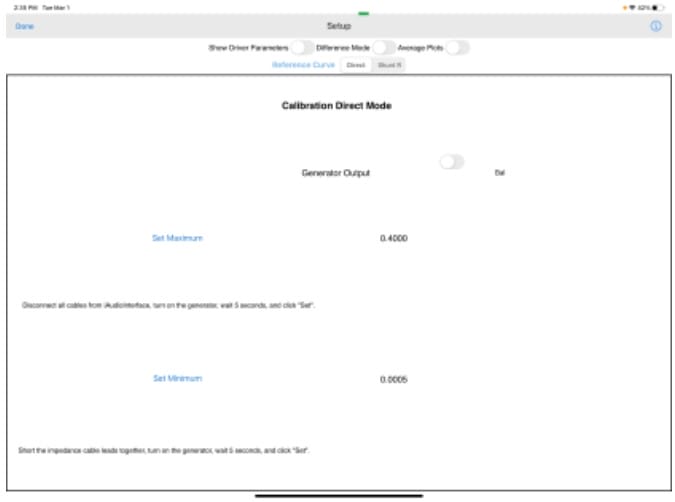 - Plug the TRS plug into the output jack of the iAudioInterface and touch the Wrench below the plot to calibrate the tester. This displays the Setup page.
