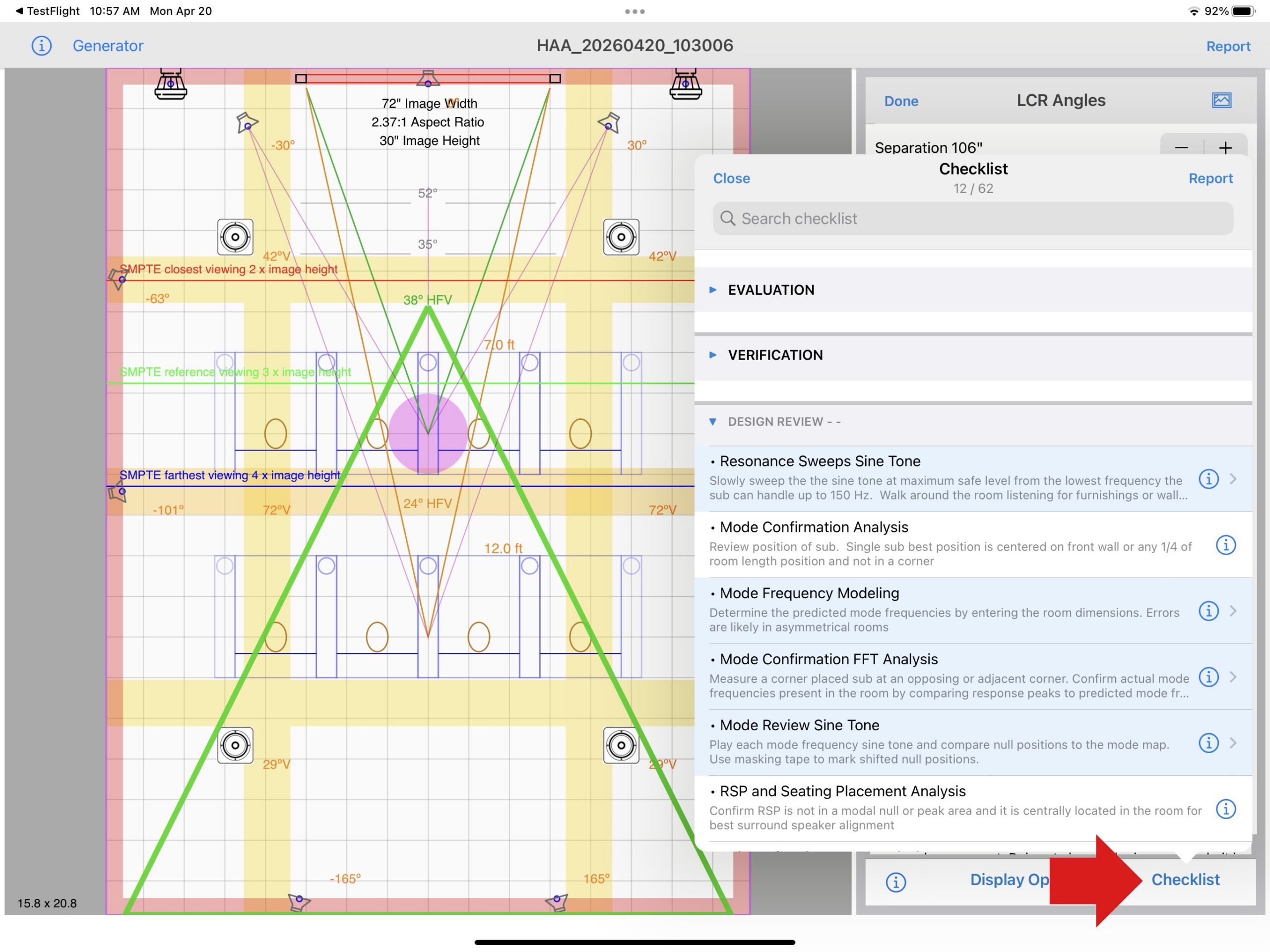 The Analysis Suite main page is the Design Review. This full featured drawing allows the calibrator to see critical layout relationships we call the Acoustical Framework. Each element of the framework is entered, and at a glance, the current status plus opportunities for improvement are clear. Click on the image for a better view.